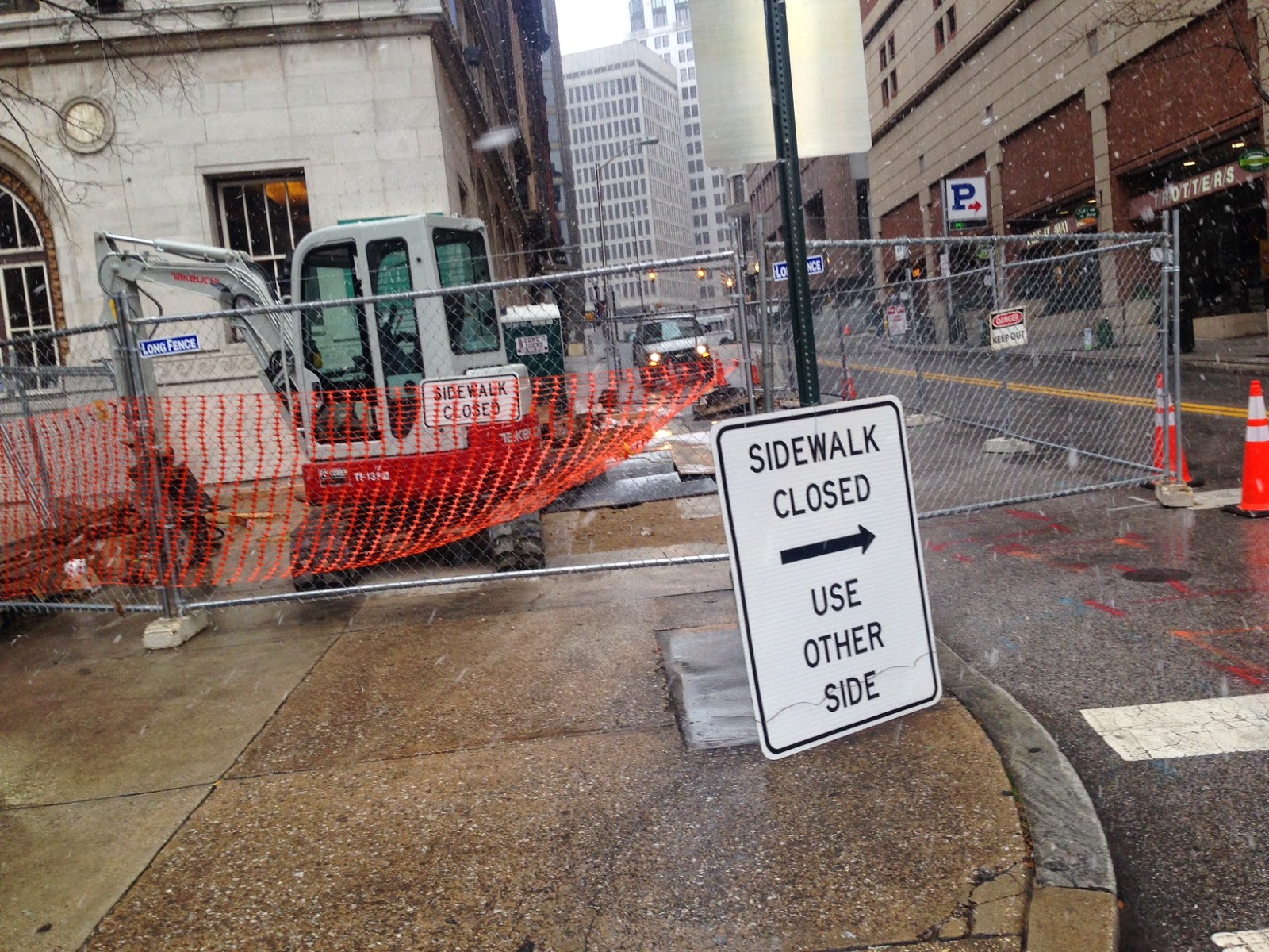13. No construction sites that simply close the sidewalk, saying "Pedestrians use other side" (this costs the public nothing, it requires simply that no sidewalk closure permits are given unless a safe pedestrian route on the same side of the street has been established)