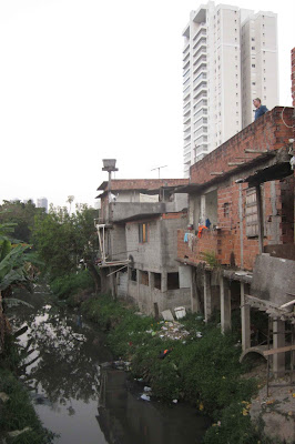 | Comunidade Campo Grande Jurubatuba, an informal settlement in Santo Amaro subprefecture, São Paulo. Magic Condominium Resort tower in the background. |