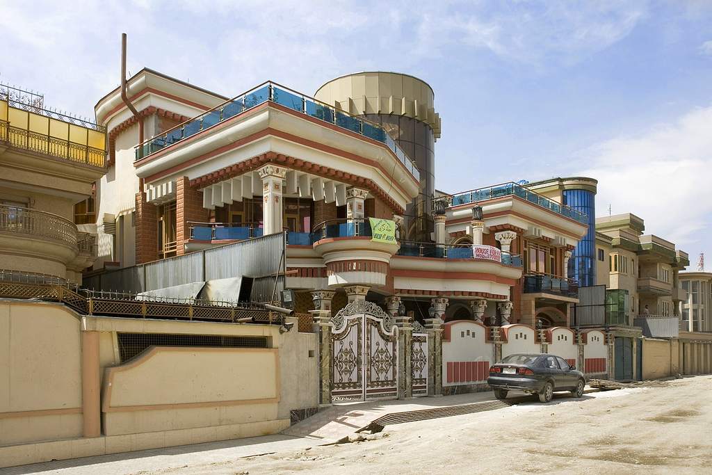 Originally a low income neighborhood of informal, mud brick housing, Sher-Pur was subject to government land grabs around 2004 and is now Kabul's wealthiest neighborhood. Built up using mashup of imported architectural designs from Dubai, the neighborhood is full of massive poppy palaces and narco palaces, a reference to the illicit capital flows that drive the construction of these buildings. These single-family houses frequently contain as much as 45 bedrooms, and many were constructed primarily to facilitate the interests of the international humanitarian regime. For years, NGOs commonly pay anywhere between 12,000 USD and 100,000 USD per month to rent these structures for their staff. Yet now as the international community pulls out ahead of the 2014 NATO withdrawal deadline, many of these elaborate mansions are sitting empty. Sher-Pur is already becoming a ghost town of opulence.