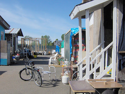 The issue of engaging design professionals also comes up in the context of the European refugee crisis. Cities have to deal with tens of thousands of refugees that need accommodation quick. Gradual self-governed development of a village like the one in Portland isn't even an option, let alone the construction of regular affordable multi-family housing. Neither can be created fast enough to keep pace with the stream of refugees. On the other hand,accommodation in camps stamped out by government, nonprofit relief agencies or even the military often results in squalid inhumane accommodations that defy human dignity with their total lack of consideration for design or place. Some architects have stepped up with their ability of creating recognizable and more pleasant spaces by considering design beyond the military way of creating rows of tents, containers or barracks which are so characteristic to refugee camps and been praised in an article in the German weekly Der SPIEGEL).